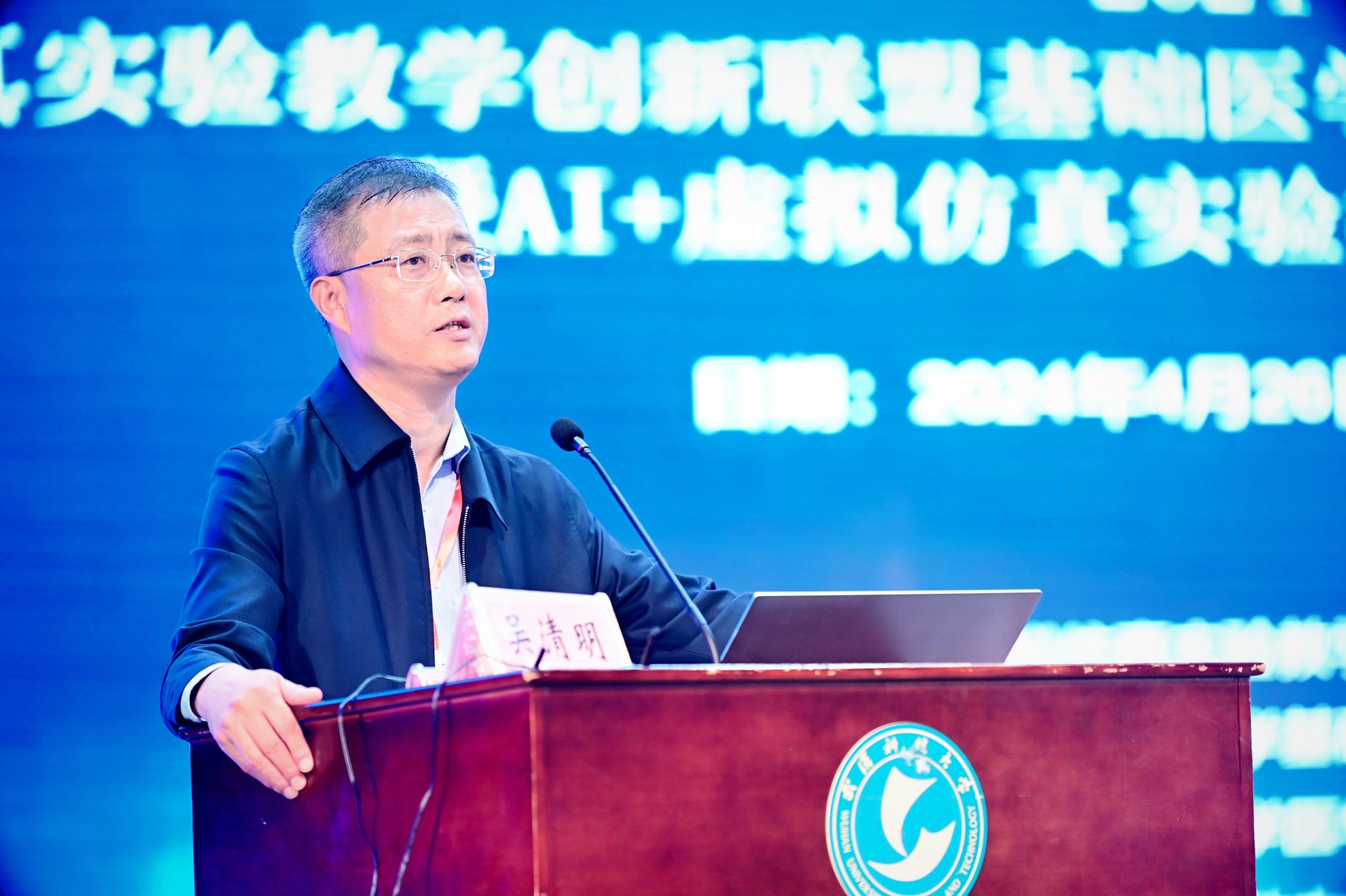 吴清明代表学校致欢迎词,对各位专家的到来表示热烈欢迎,并从学校和学部发展的历程、现有的教育层次及专业设置进行了详细介绍。他指出虚拟仿真实验教学作为现代医学教育的重要手段,对于提升教学质量、培养创新人才具有重要意义。希望通过此次会议,汇聚各方智慧,共同推动基础医学类虚拟仿真实验教学的发展。