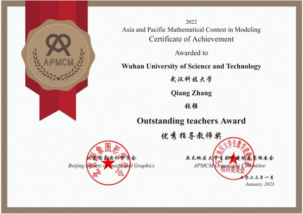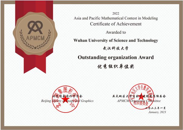 武科大网讯 近日,2023第十二届亚太地区大学生数学建模竞赛(APMCM)获奖名单公布,白菜官网数据分析与建模协会斩获一等奖2项、二等奖2项、三等奖8项,两项一等奖的队伍是统计2101班黄宇轩、信计2102班王洪星、统计2102班张作奇和车产2102班吴天一、车产2101班黄佳南、计卓2101班郭庆哲;白菜官网荣获“优秀指导教师奖”和“优秀组织单位奖”。