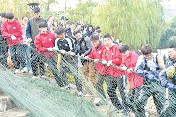 上午8时,整齐划一的拉网号子声回荡在湖面上,学校近百名中外师生和后勤集团员工在沁湖边拉开了捕鱼活动的序幕。10时许,随着一声“起网”,一条条鲜活肥硕的鱼儿在水面上翻飞跳动。
