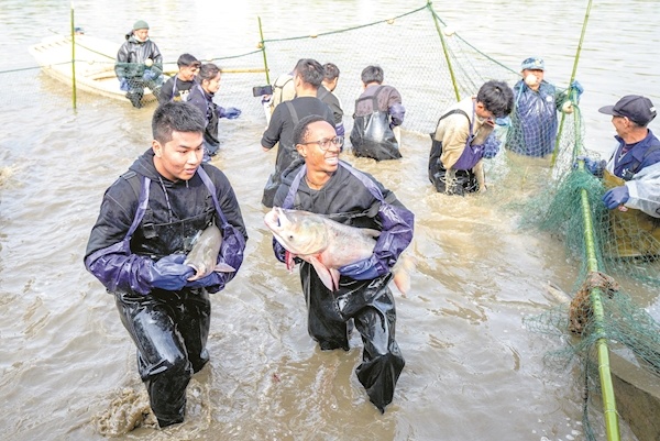 赞比亚留学生Chishimba Mutale已连续四年吃到了“沁湖鱼宴”的免费鱼肴,这是他第一次参与拉网捕鱼的环节,亲手捕到大鱼后他心情十分激动:“感谢学校给我们这样的机会体验!”